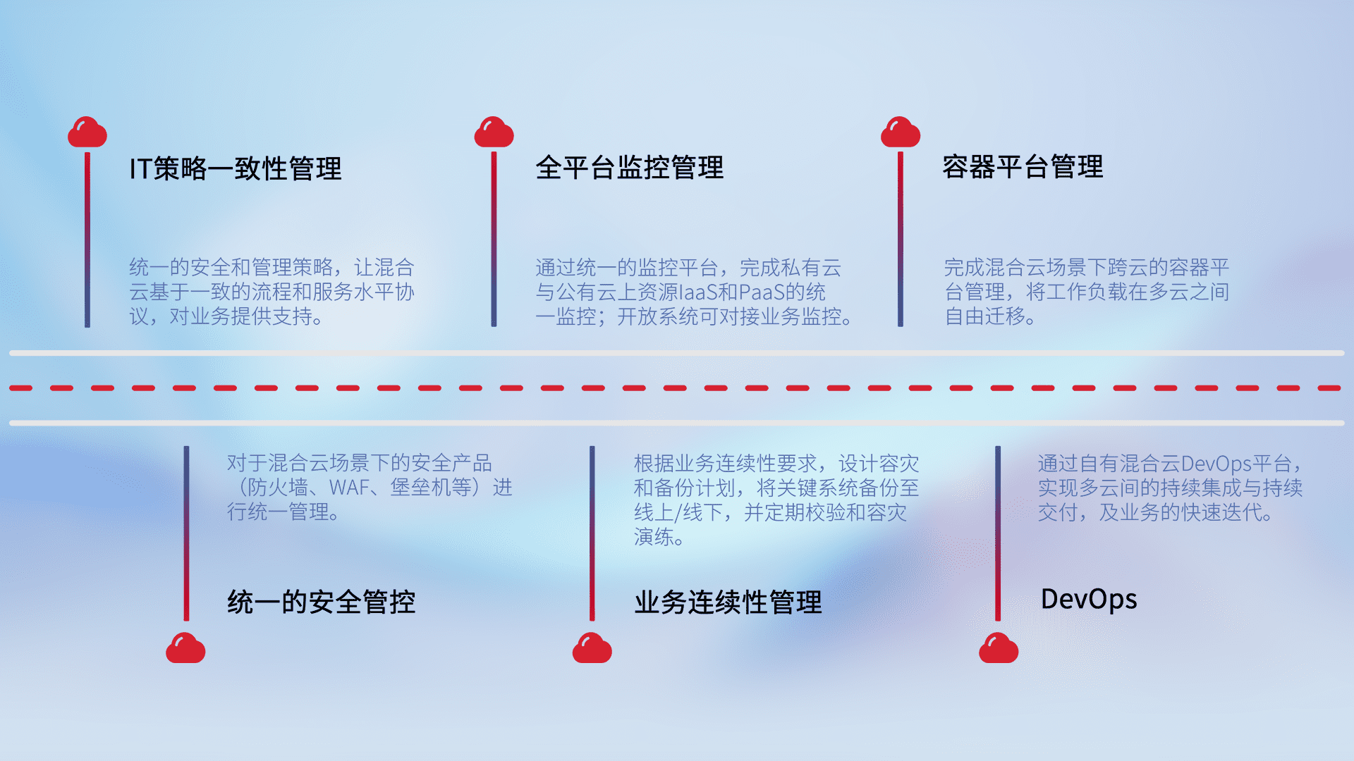通过多云纳管,,,,以统一的资源数据模型把客户的云资源进行抽象和封装,,进而实现对多云资源的统一操作,,,保障云资源管理的可靠性、、稳定性与可用性。。。量身定制化运维内容,,,配置、、开发运维、、补丁管理、、、备份、、监控、、、认证和访问管理、、、审计和日常巡检等,,保障在用云过程中的可靠度,,,稳定度以及高可用率。。。。