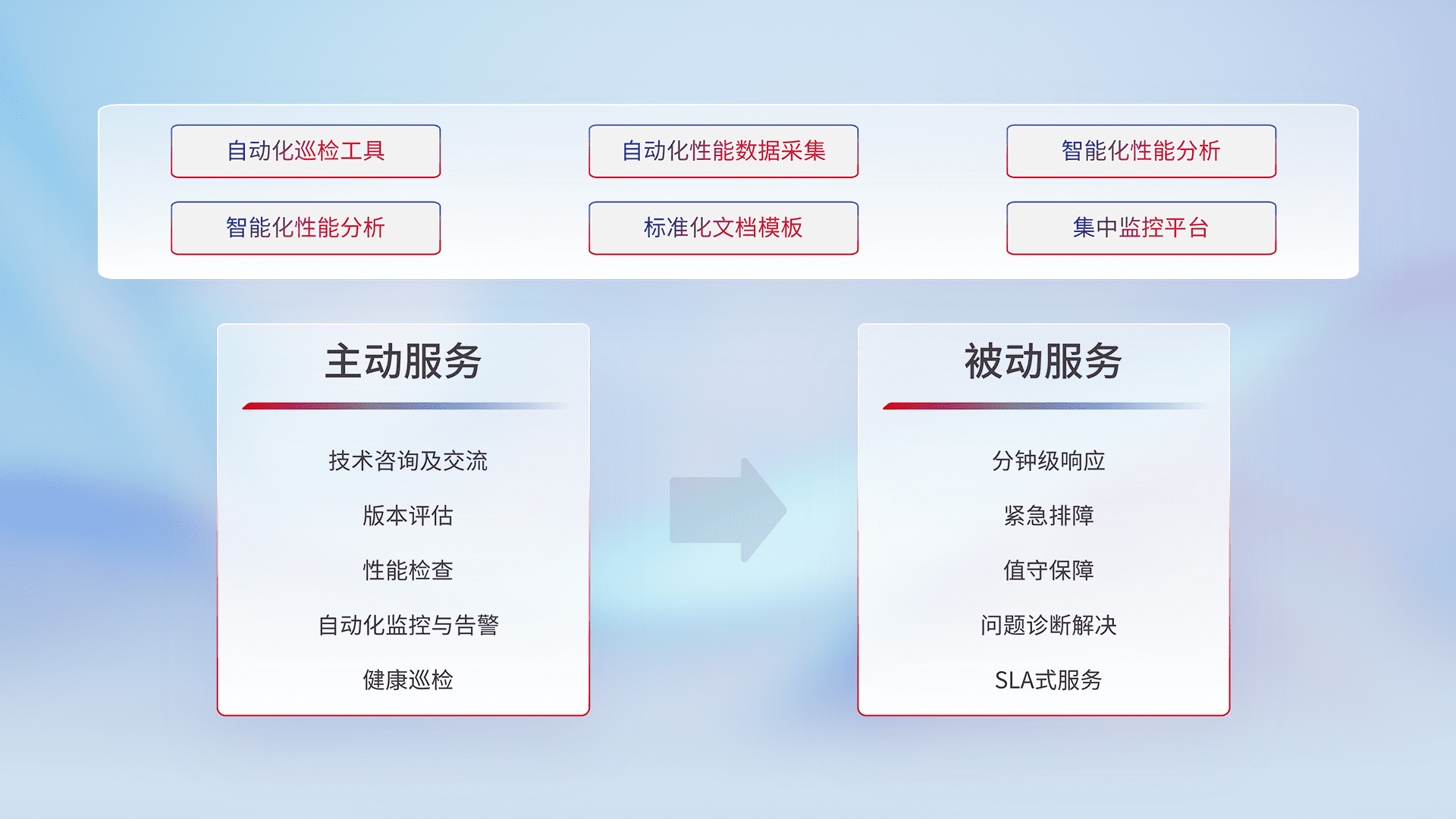 智能化工具和标准化文档,,,保障服务质量,,,提供主动服务(包含技术咨询、、、、版本评估、、、、性能检查、、自动化监控与告警、、健康巡检)和被动服务包含(分钟级响应、、、、紧急排障、、、值守保障、、问题诊断解决、、、、SLA服务)。。